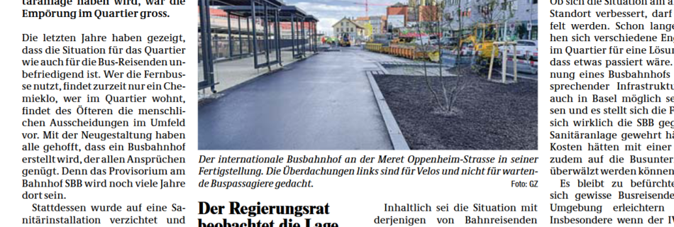 Als bekannt wurde,  dass der internationale Fernbusbahnhof an der Meret Oppenheim-Strasse beim Bahnhof SBB keine Sanitäranlage haben wird, war die Empörung im Quartier gross. Die letzten Jahre haben gezeigt, dass die Situation für das Quartier wie auch für die Bus-Reisenden unbefriedigend ist. Wer die Fernbusse nutzt, findet zurzeit nur ein Chemieklo, wer im Quartier wohnt, …