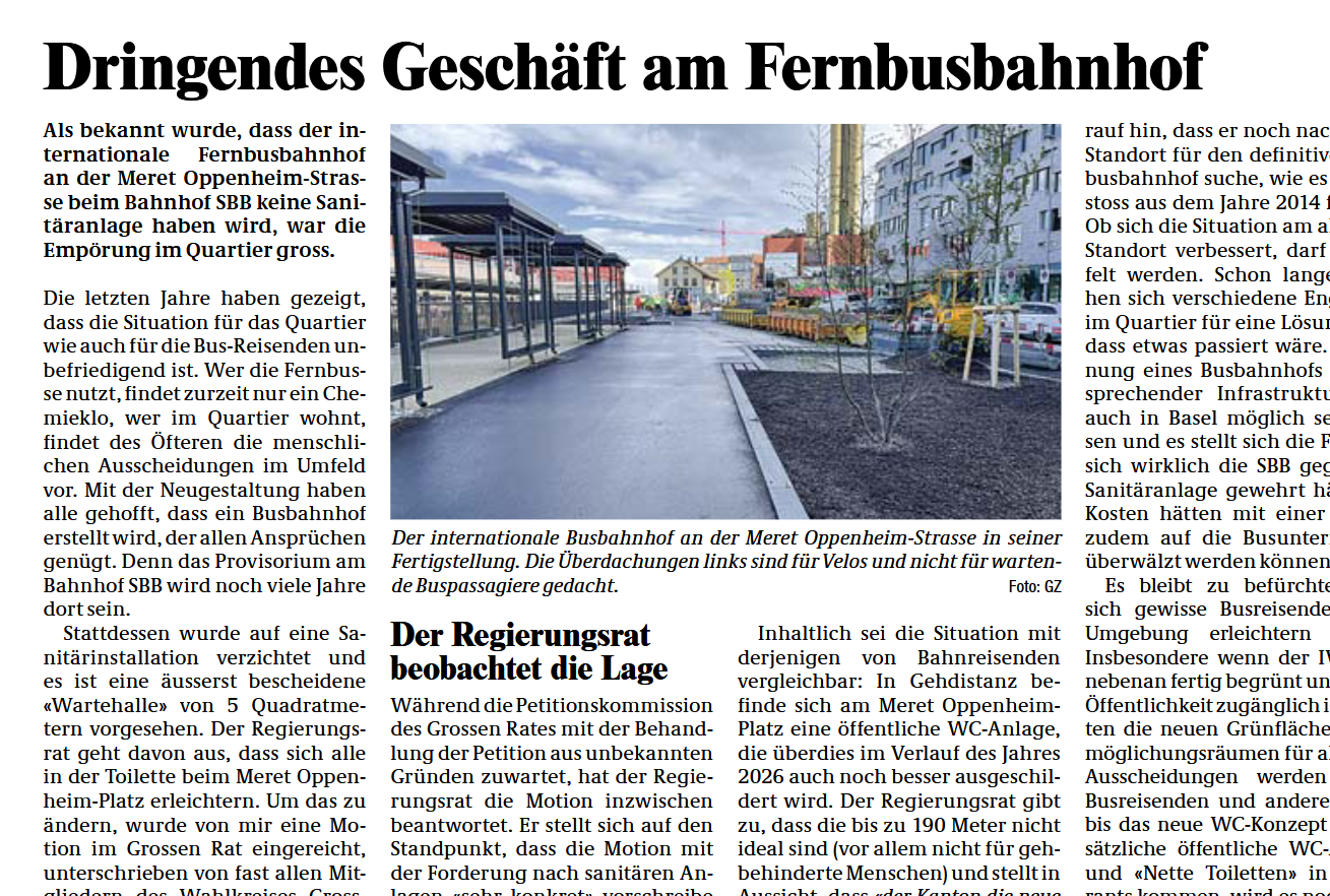 Stattdessen wurde auf eine Sanitärinstallation verzichtet und es ist eine äusserst bescheidene «Wartehalle» von 5 m2 vorgesehen. Der Regierungsrat geht davon aus, dass sich alle in der Toilette beim Meret Oppenheim-Platz erleichtern. Um das zu ändern, wurde von mir eine Motion im Grossen Rat eingereicht, unterschrieben von fast allen Mitgliedern des Wahlkreises Grossbasel Ost und dann im Dezember unbestritten an den Regierungsrat zur Stellungnahme überwiesen wurde. Zeitgleich sammelte ein breites Komitee im Gundeli eine Petition an den Grossen Rat (Petition P505 „Internationaler Busbahnhof: Visitenkarte für Basel“), die mit über 1000 Unterschriften eingereicht wurde.